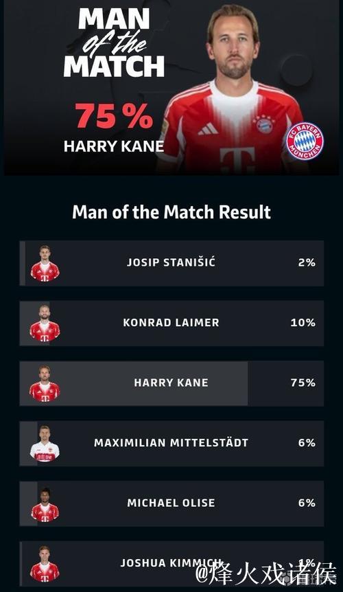 替补戴帽,凯恩当选斯图加特vs拜仁全场最佳球员